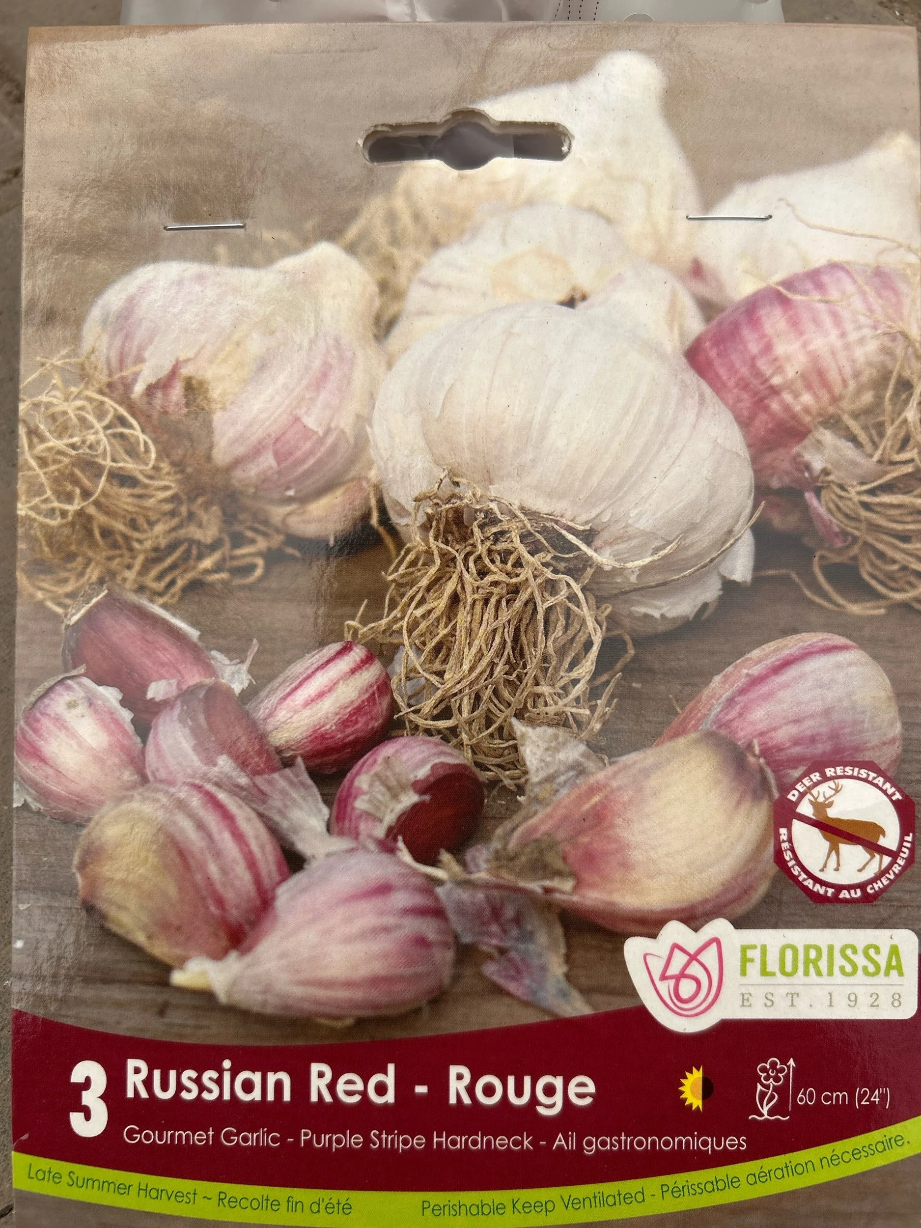 Garlic Russian Red - A hot, strong garlic flavour with a warm, sweet aftertaste. The large bulbs have a distinctive slightly purple wrapper. This garlic has the ability to withstand soggy winter soils better than others. It produces eight to 10 medium-sized cloves and stores for six to eight months.